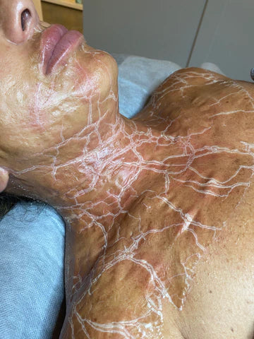 Once the DMK enzyme treatment graces your face, neck, and décolletage, it embarks on a remarkable journey. Initially, it takes on a hardening process akin to a cement setting. Over time, it moulds and tightens, cocooning your skin as you luxuriate on our plush treatment beds for approximately 45 minutes. The sensation may surprise you at first, but soon, you'll revel in the satisfying feeling as our potent cosmeceutical enzymes and botanicals commence their transformative work. Remarkably, you can feel the results even before you witness them, an experience like no other.